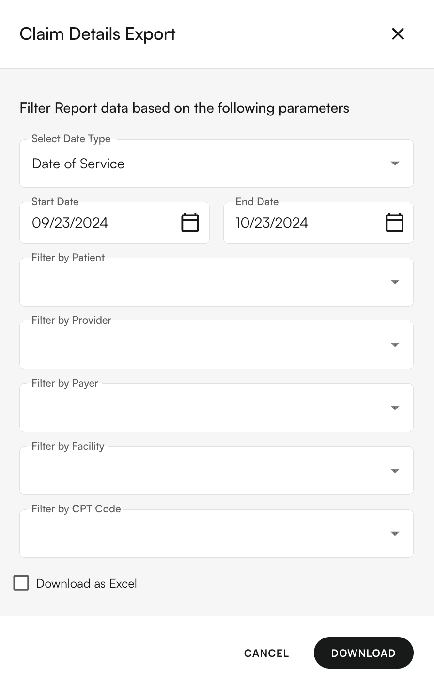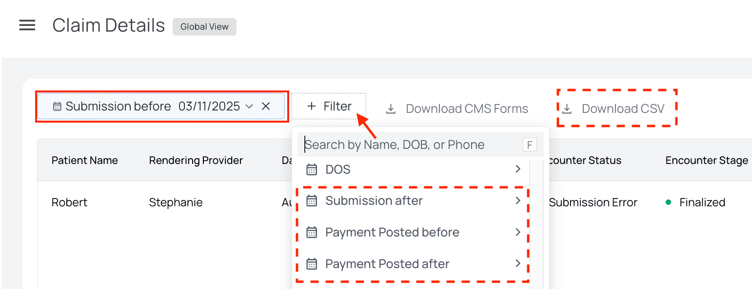 Download CSV on the Claim Details page, however, it will respond to the exclusive filters you’ve set. These filters include ‘Submission Before,’ ‘Submission After,’ ‘Payment Posted Before,’ and ‘Payment Posted After.’