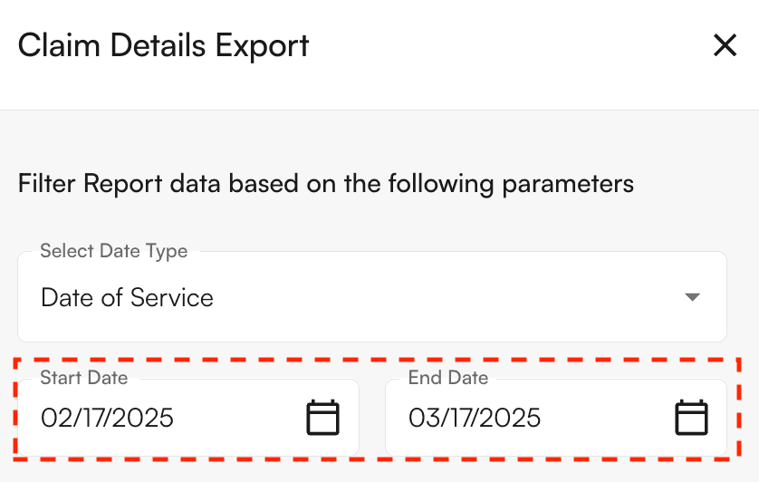 - The total billed amount is based on the latest primary claim submission for each encounter. The filters available here differ from the filters on the Claim Details page. Here, you’ll select the report’s inclusive date range, i.e. ‘Start Date’ and ‘End Date.’