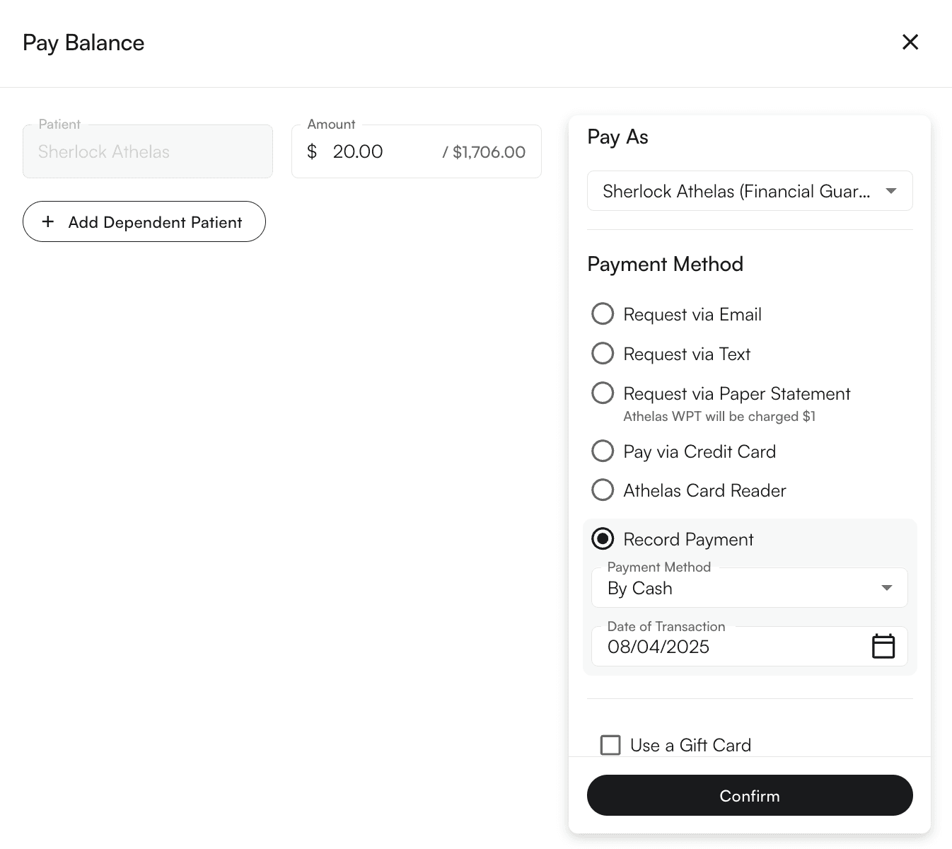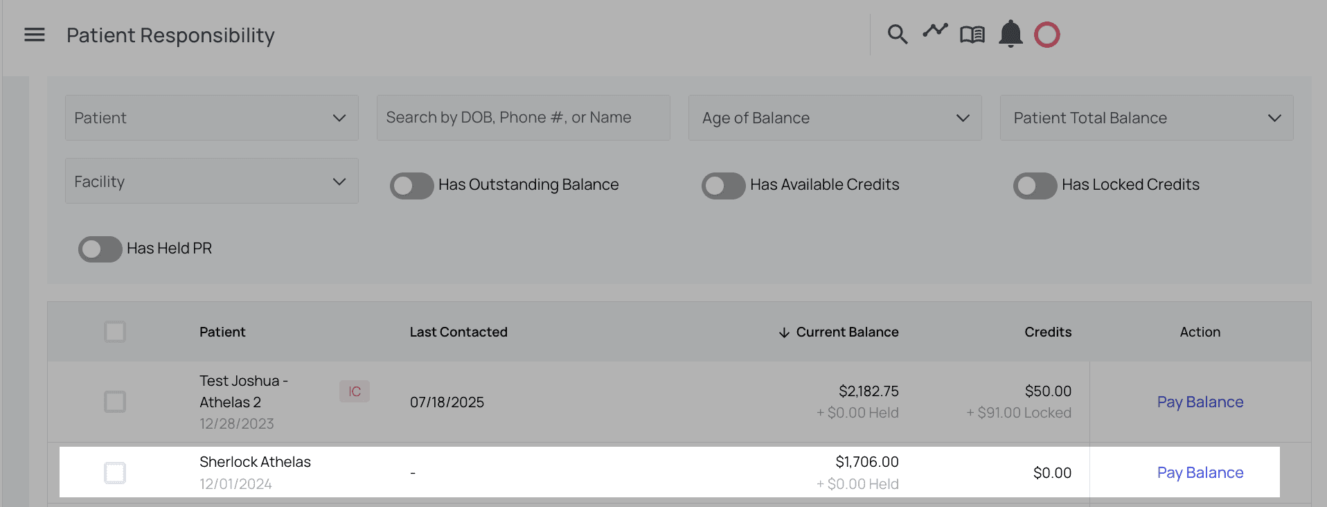You can access patient payment records in a number of ways on Insights. For the purposes of this tutorial, we’ll simply go through the Patient Responsibility page, though the process is essentially the same from the Appointments page or the patient profile. First, choose a patient with an outstanding balance and click ‘Pay Balance.’
