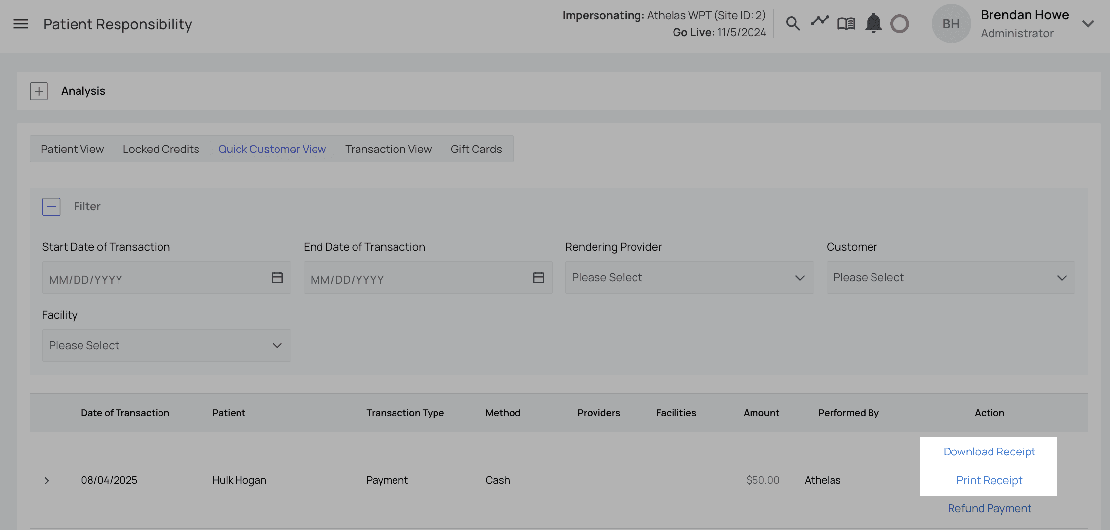 In the Action column, you can Download Receipt, Print Receipt, or Refund Payment.