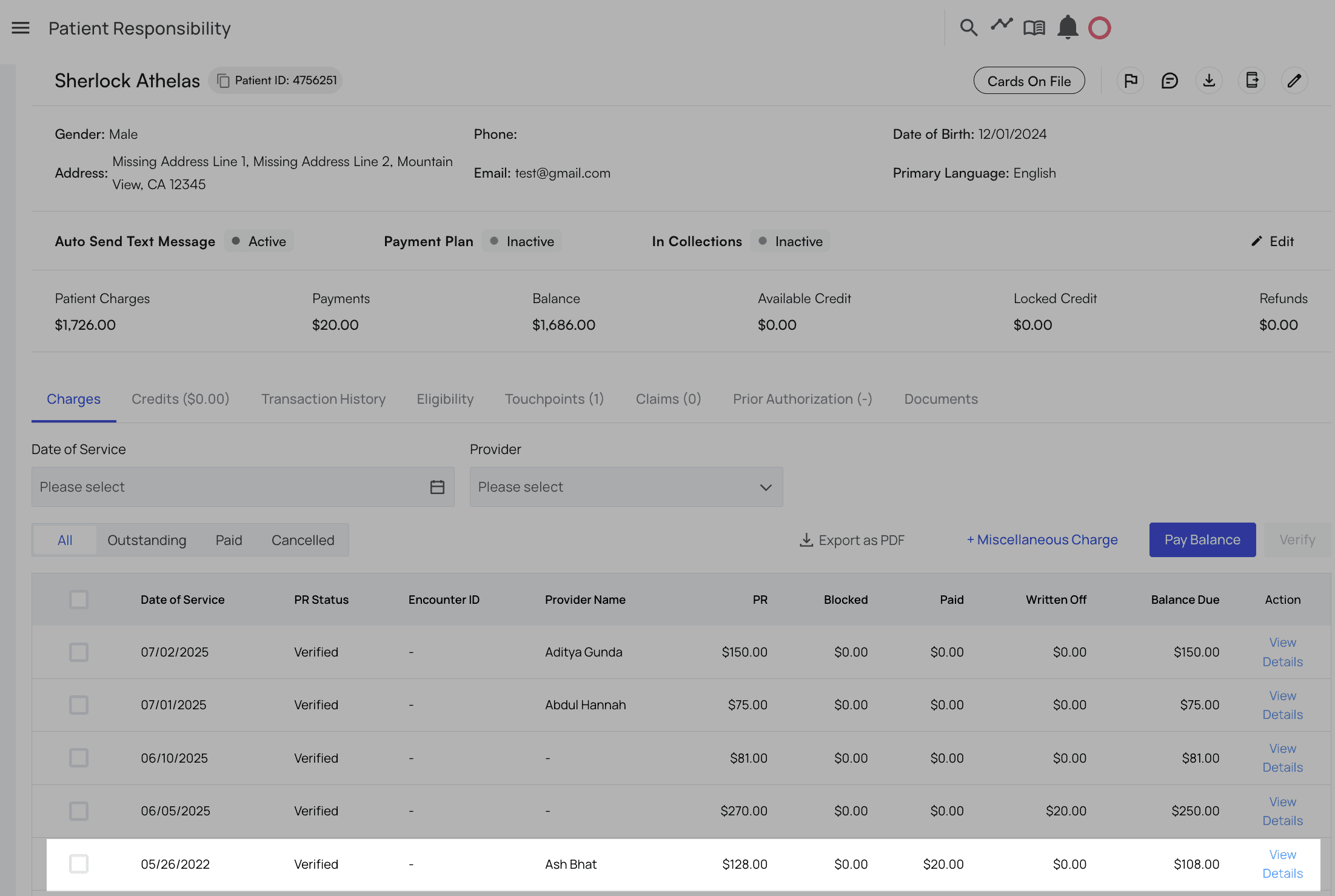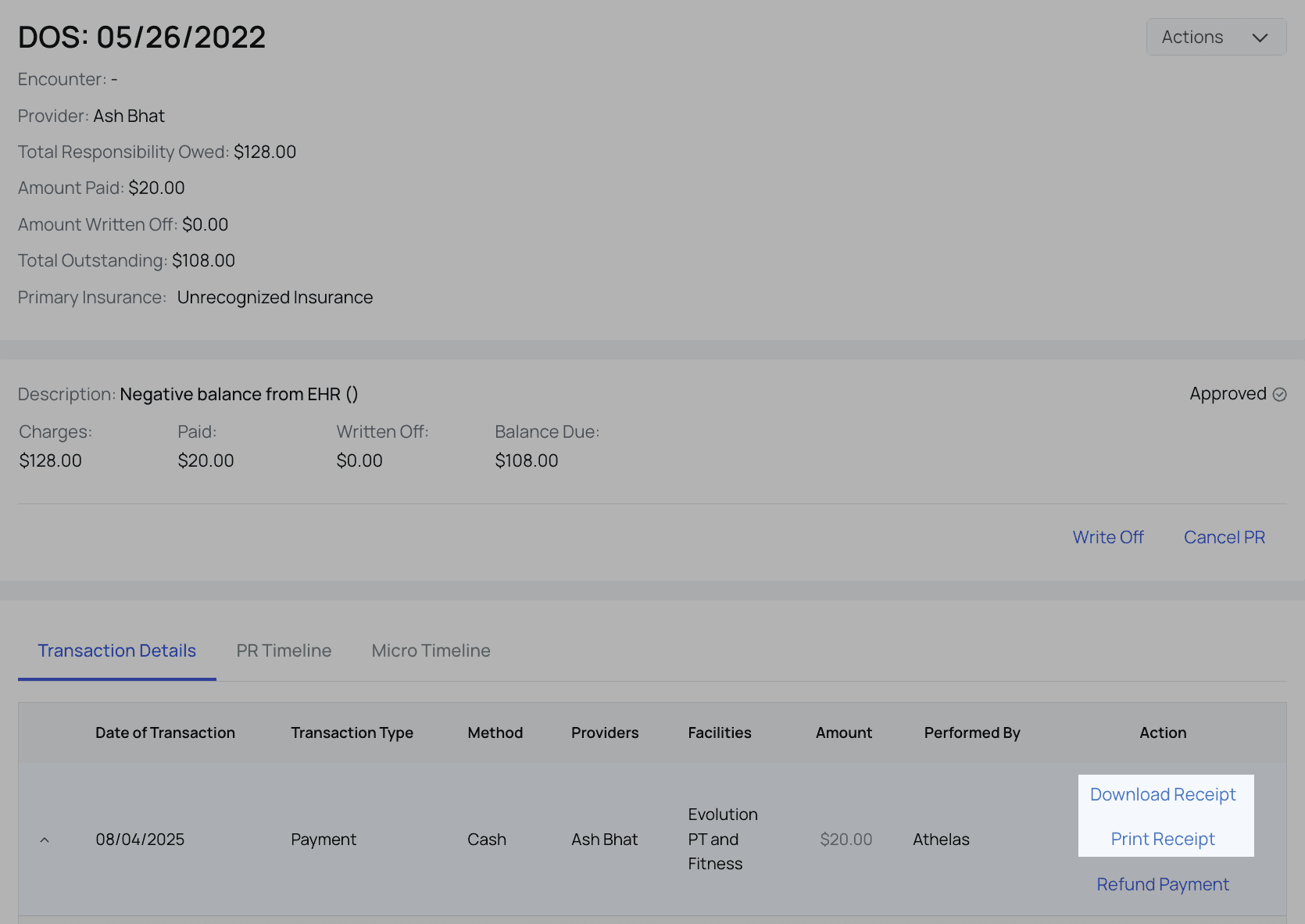 Go to the profile of the patient in question. Under the ‘Charges’ tab, find the row for the date of service for which you would like a receipt and clickView Details.