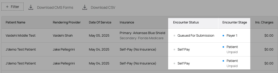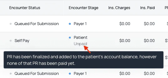 Encounters are created for each appointment. If the claim submission is successful, then primary insurance—or Payer 1—will either deny the claim or send a remittance and pay at least part of the claim. Once Payer 1 pays everything they’re going to pay, any remaining balance is pushed to the next payer. This process repeats either until the claim is balanced or there are no more payers and the balance is pushed to PR.Definitions of Stage and Status Terminology