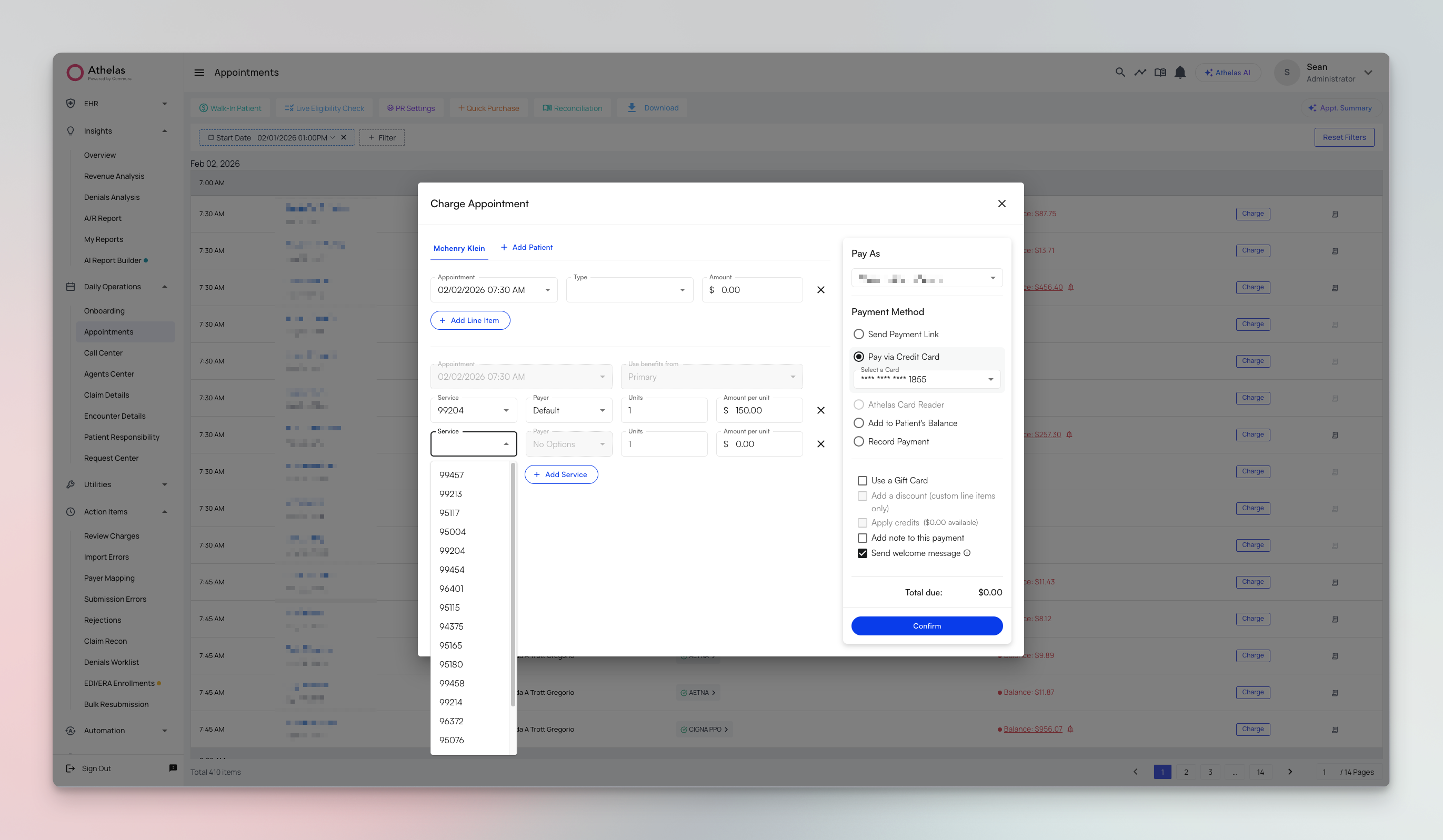 You can add service items to any appointment, and the system will calculate the charges based on your configured CPT rates. To add service charges: