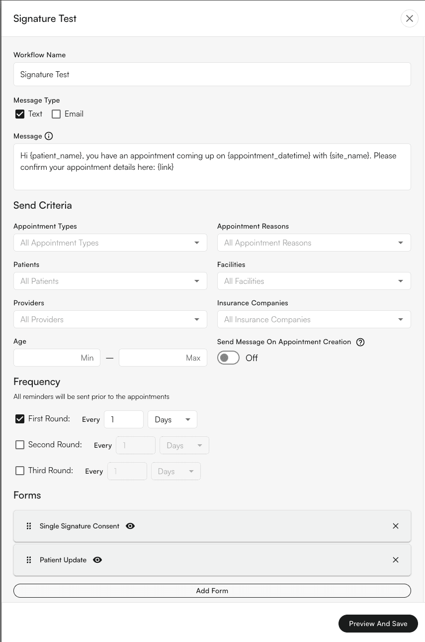 - Maximum Age: Specifies a maximum age a patient cannot surpass in order to receive this workflow The option to send out intake forms immediately upon the creation of an appointment matching the workflow’s specifications is also available. Simply check the box next to Send Immediately on Appointment Creation. Additionally, there are two methods that the workflow can be sent by: email and/or text.