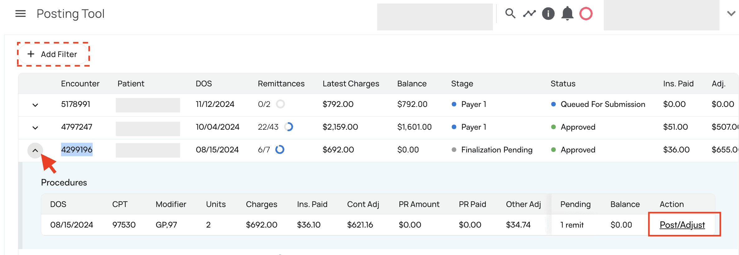 This walkthrough illustrates an efficient method using the Posting Tool page. Navigate to the Posting Tool and filter for the encounter in question. Click the arrow next to the encounter to see all its procedures. Find the one you’d like to edit and clickPost/Adjust.