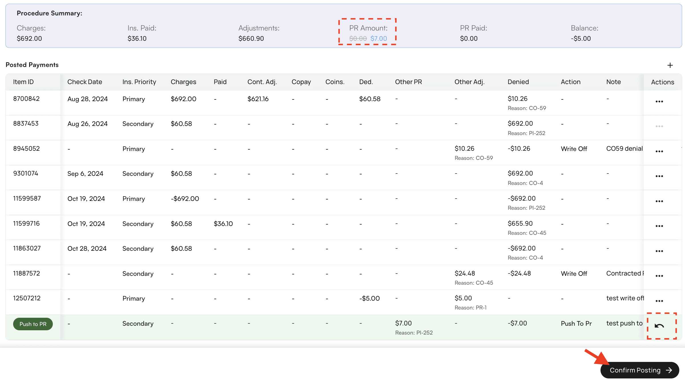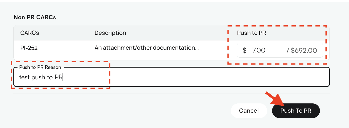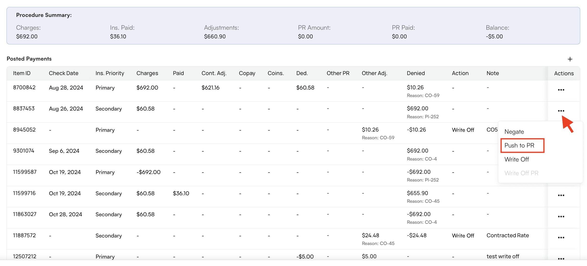 Click into a claim on the Claim Details page (or Denials Worklist or Rejections), then open the ‘Actions’ menu in the top right corner and selectPush to PR.