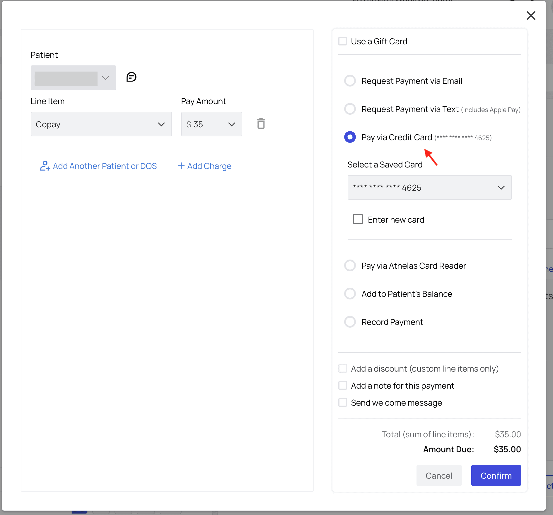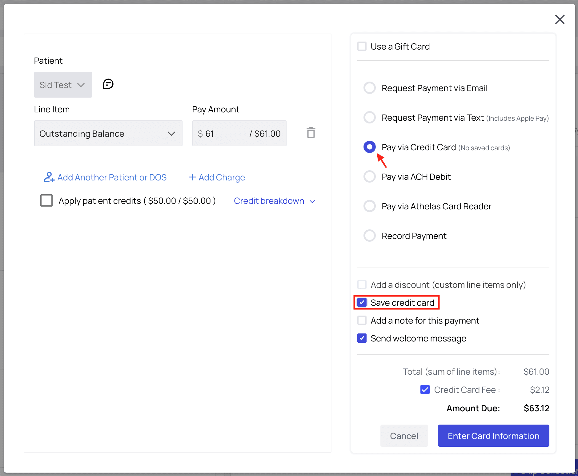 Pay via Credit Cardoption. Select that option and then you can manually enter the patient’s card details for immediate processing.