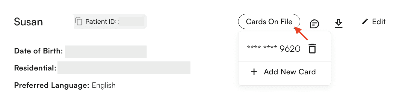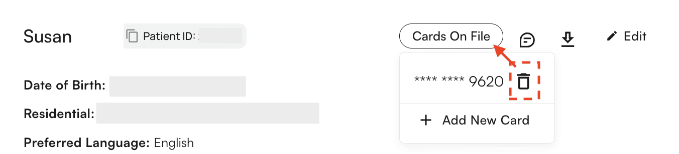 - Remove a Saved CardTo remove a saved card, open the ‘Cards on File’ dropdown menu on the patient’s profile and click the trash icon next to the card you want to remove.