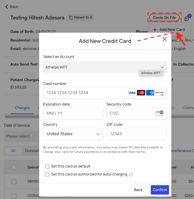 - Add a Card Without ChargingIf you would like to put a card on file without charging it, navigate to the patient’s profile and click on the ‘Cards on File’ dropdown menu.Then, click