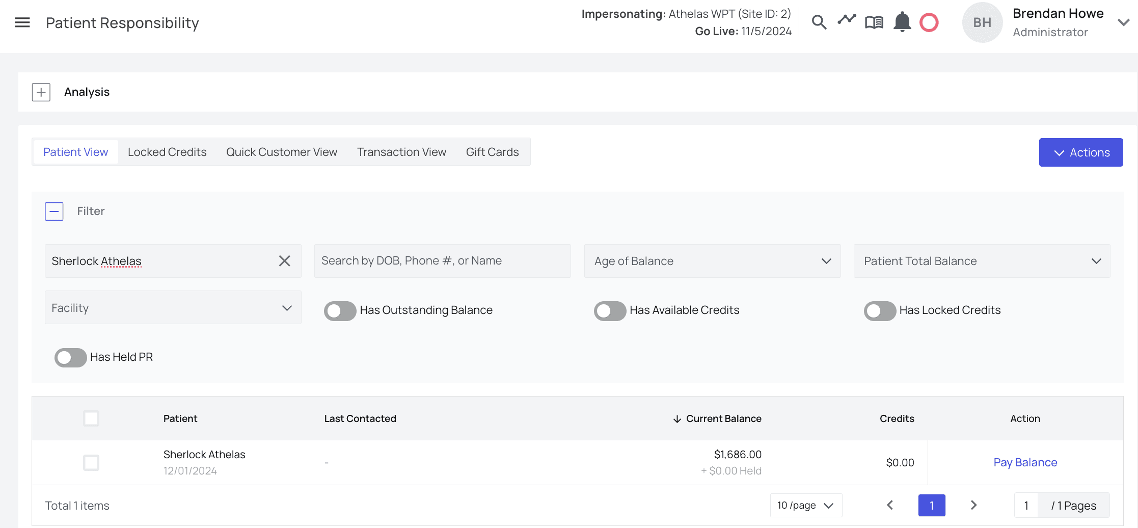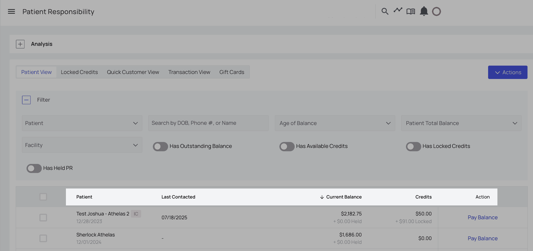 The Patient View tab shows a list of all patients, when they were last contacted, their current balance, and any unapplied credits they may have.