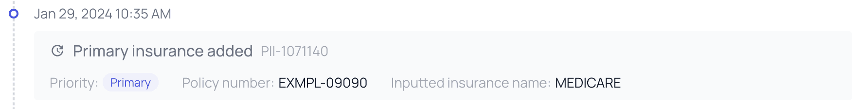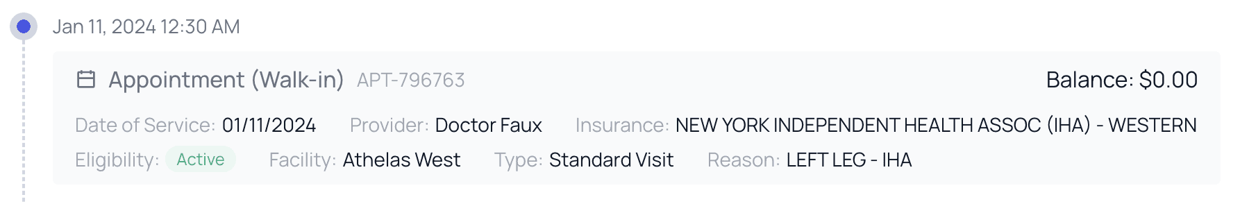A PR Timeline may contain anywhere from a single Appointment card to nearly every possible PR factor in the book. Below is an example with a fairly standard number of events included in it. Let’s walk through an example: Below we can see thatPatient X had a walk-in appointment on Jan 11th, and that their insurance eligibility came back as ‘Active.’