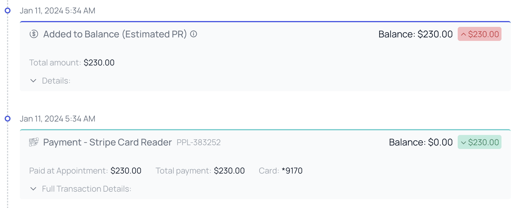 - You can see the patient’s balance momentarily increase to $230 and then zero out again as the placeholder PR balances the payment.