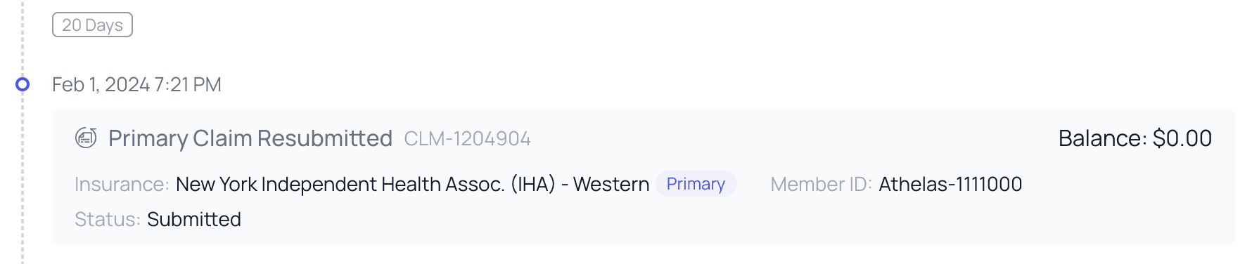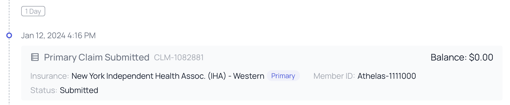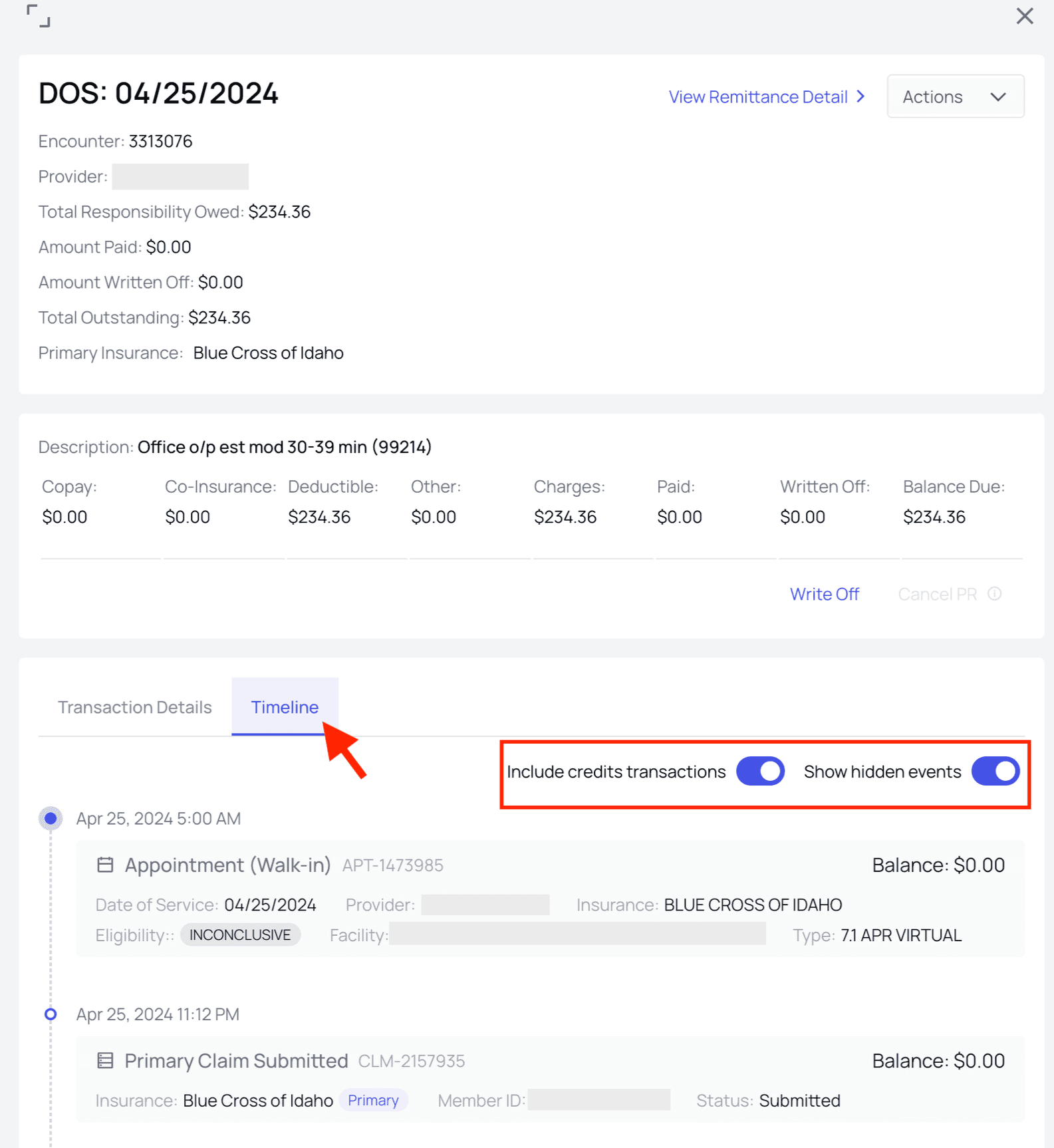 The PR Timeline chronologically displays every event related to PR and Payments for a particular Date of Service (DoS). It functions as a snapshot of PR for a given DoS, at any point in time. You can view when the appointment took place, when claims were submitted, all the way through to when balances were updated and payment was fully applied.🕰️ Finding the Timeline