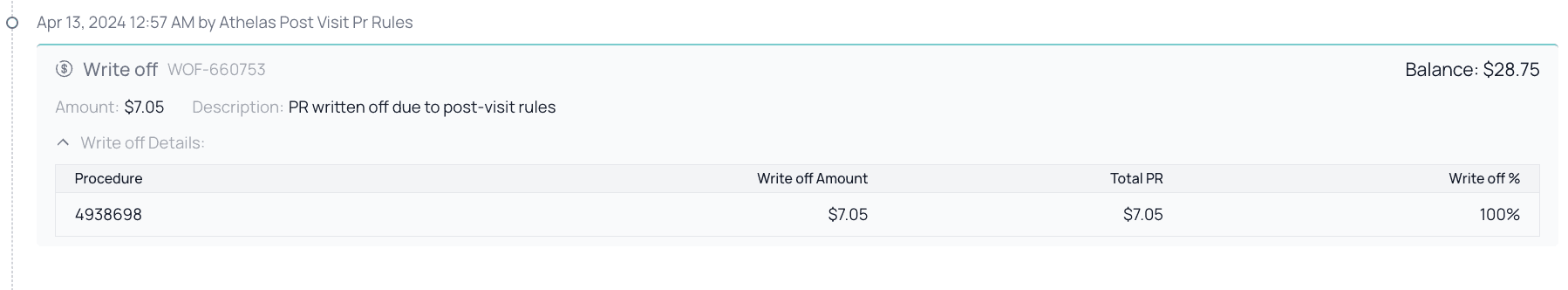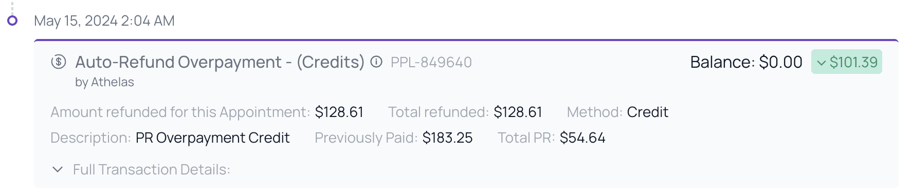 - After the remittance is received, you can see the patient’s PR balance updating to the corrected amount. The patient now has a surplus of $101.39.