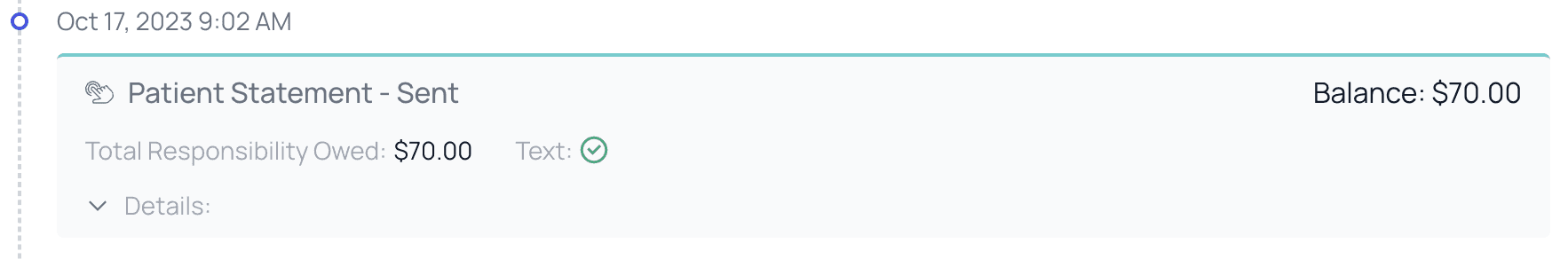 In the upper right of each card you’ll find a running balance for the patient — if you ever need to know how much a patient owes at this precise moment in the process, you’ll find it listed here.- We also include a card showing the change to the balance since the last card.