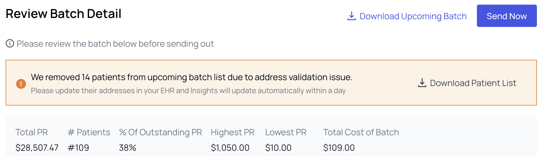 Keeping an eye on the batch-level analytics is important, but at the end of the day the most important metric is: how much have you been paid, and how much is still owed? This is precisely what is tracked at the top of the Patient Statements tab, so you can swoop in and know in a few seconds how your practice is performing on PR collections overall.