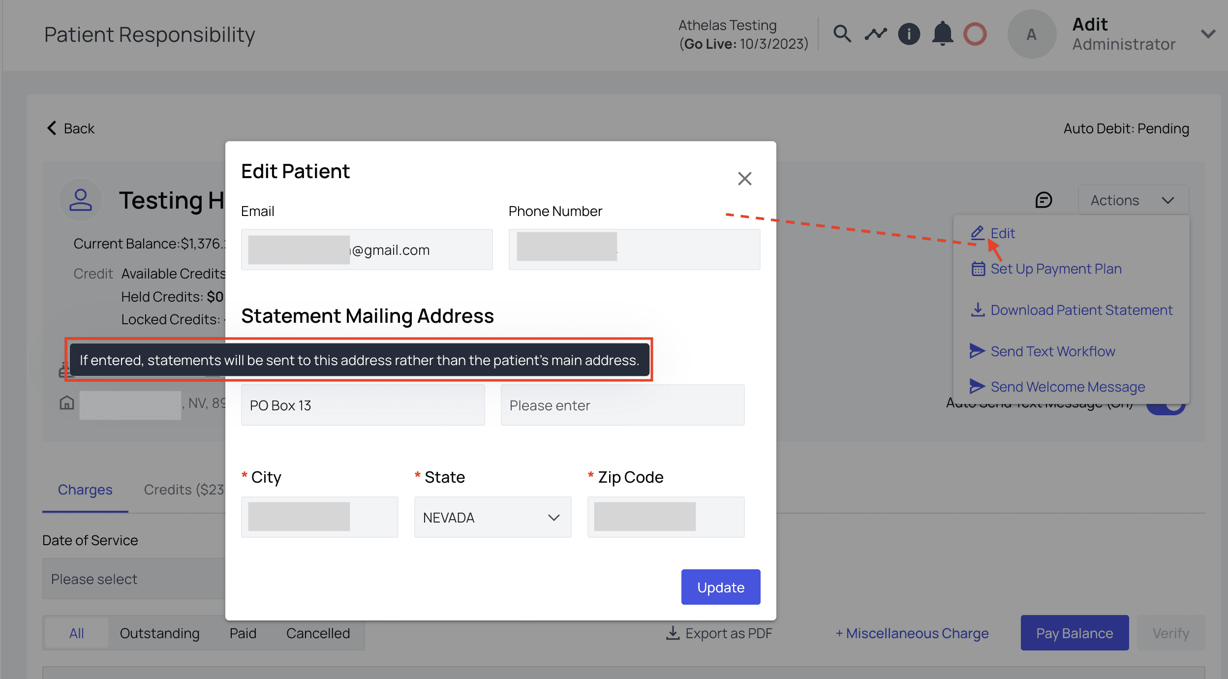 - Visit a patient’s profile, and find the “Pay Balance” button.
