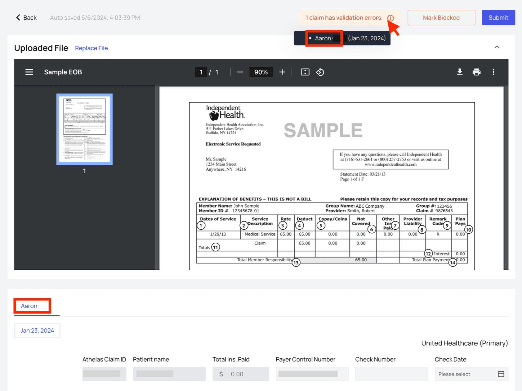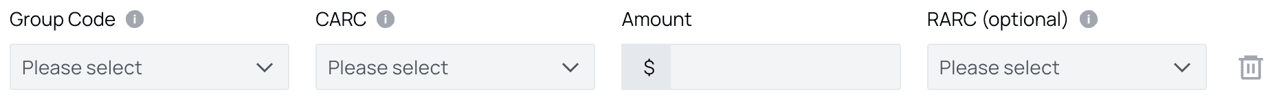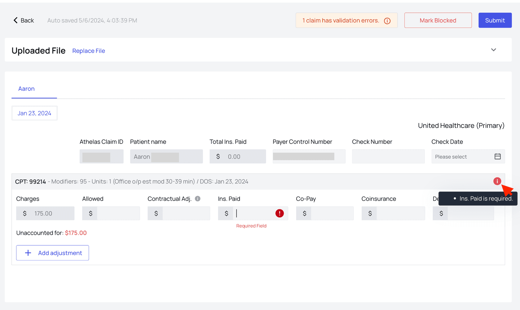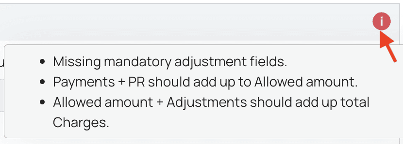 Autosave This portion of the tool will automatically save your progress. Now it’s time to fill in the key data from the EOB. Keep an eye on your count of validation errors next to the submit button. This keeps a live tally of issues that need to be resolved in the EOB. Moving your cursor over this note will provide a list of the specific patients’ claims where the issues are located. Find the patient/claim with an error, indicated by red ‘Information’ icons. You can then hover your cursor over the icon to the right of the CPT code description to discover what the specific issue is and rectify it. If your EOB contains an adjustment that doesn’t fall into the most common categories, you can add a custom adjustment using the ‘Add Adjustment’ button. This is most often needed for Denials. Clicking the button will add a new row to your EOB to hold the custom adjustment: Here you’ll enter the following data: