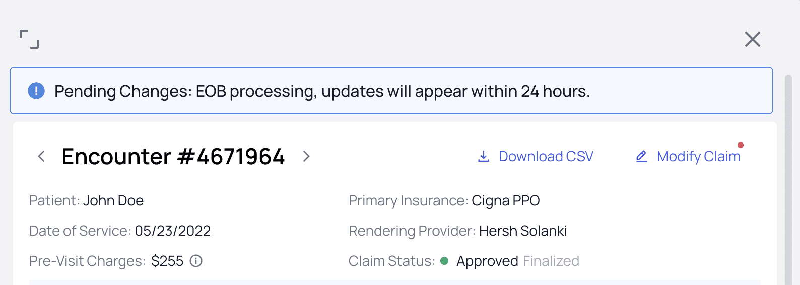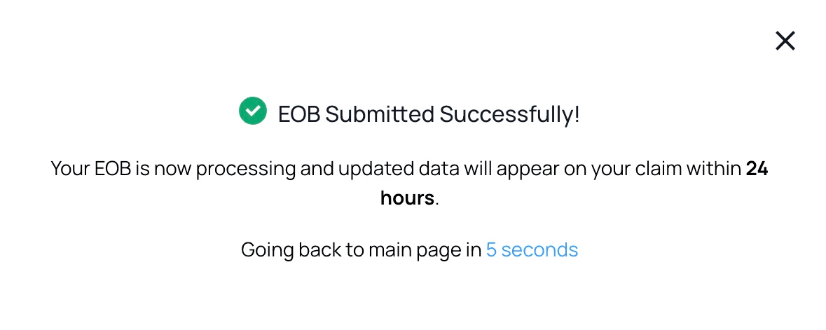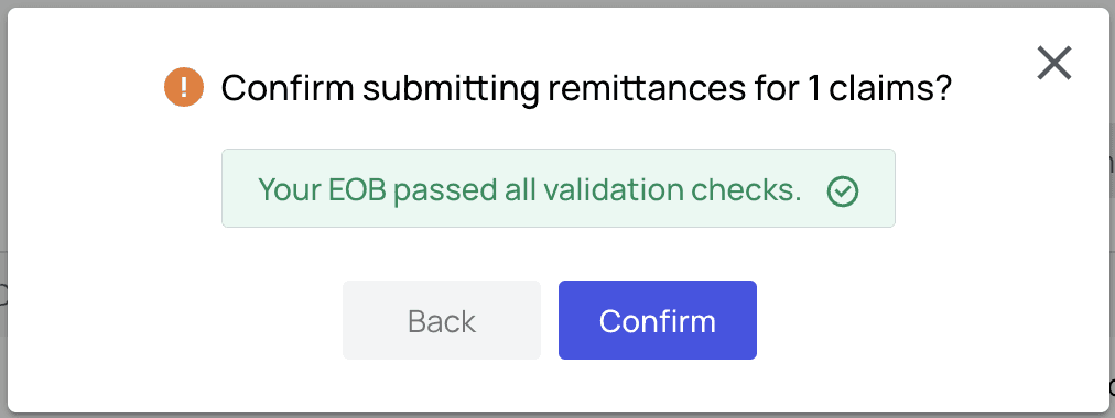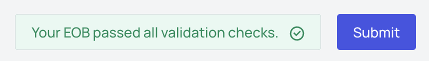 If everything has gone as planned you should now see a visual indicator that all validation checks are passing. If they’re not, this is a good moment to quickly check your work. Occasionally an EOB will truly contain data that fails validation checks. If that happens don’t worry, you can still submit your EOB! Our validation checks are purely informational, and do not prevent you from submitting an EOB. As long as the required fields are filled in, you can always submit. Click the ‘Submit’ button in the upper right of the page, and a window will pop up to request your final confirmation. Hit ‘Confirm’ to finalize your submission. The EOB will take a few moments to submit each claim linked to your EOB. For large numbers of claims this may take as long as half a minute. Once submission is complete you’ll be shown a confirmation message, then redirected back to the main EOB page. Success! And that’s it! New EOB data will show up on your claims within 24 hours. While that data is processing, claims included in the EOB will be marked with a notification so your team knows that updates are in progress.