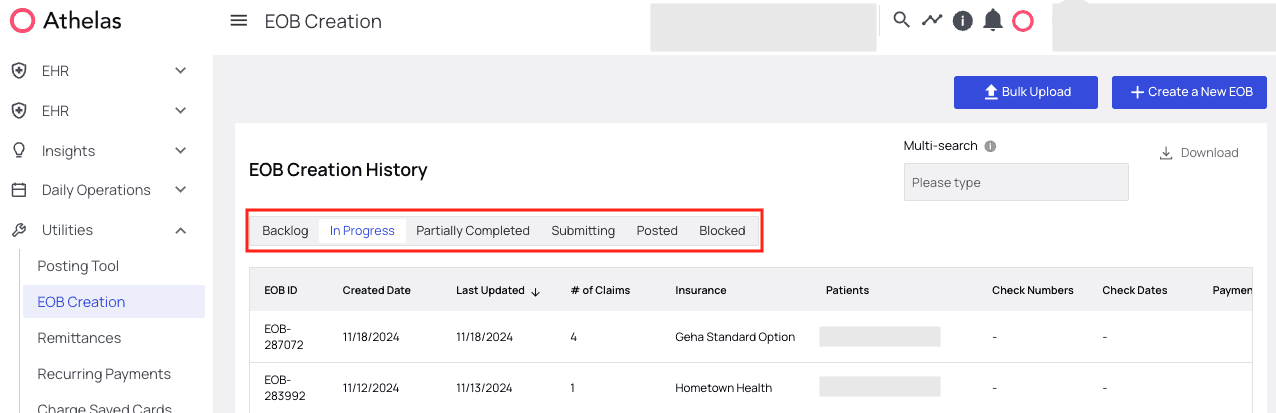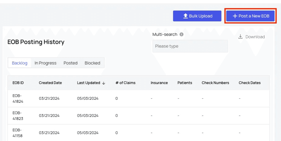 • BlockedSomething is wrong and these won’t be posted. This usually happens for EOBs that are duplicates, or have some similar issue. Within any of these tabs, use the Multi-Search function to filter the EOBs listed by EOB ID, insurance, check number, patient name, or file name.