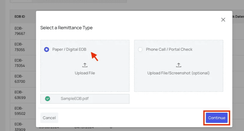 We will refer to all manual remittance types — EOBs, Payer Portal Checks, and Payer Calls — as ‘EOBs’ in this guide. Here’s how to upload a new EOB: