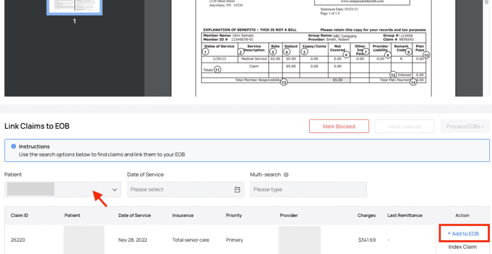 Assuming you’re starting from scratch, click the ‘Post a New EOB’ button to get started. Select the type of EOB you’ll be importing. Upload the file and then click ‘Continue.’ Uploading is not technically required. However, for accurate record keeping and quality assurance, uploading evidence of the payer decision is strongly encouraged. Next, you can use the search filters (Patient, Date of Service, Multi-Search) to find the claim(s) you want to link to the EOB. Then click ‘Add to EOB.’ Repeat this process until you’ve added all the claims you want, then click ‘Process EOBs.’