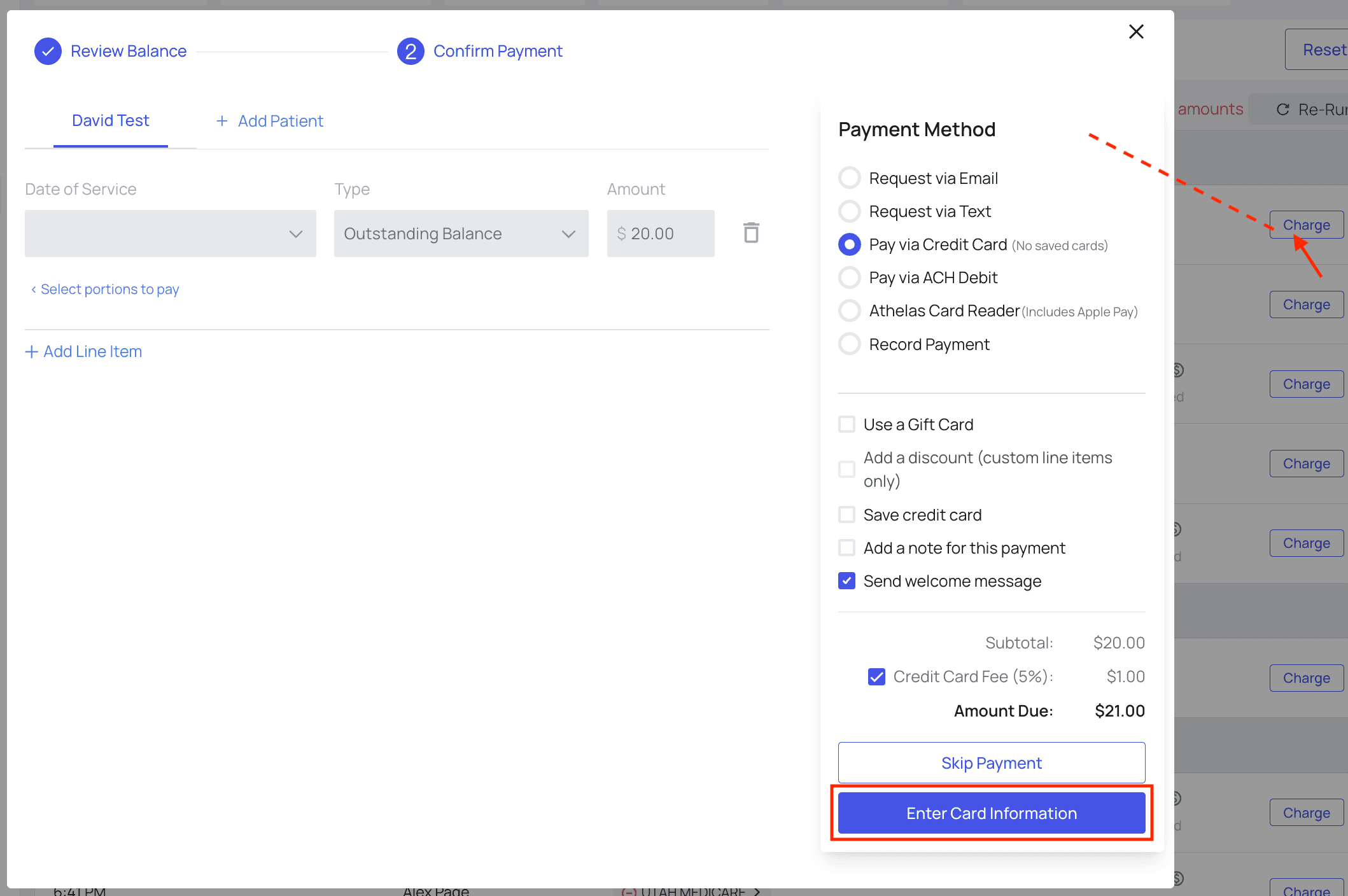 Pay via Credit Cardin the payment popup. ClickEnter Card Information. - Enter their credit card information manually.