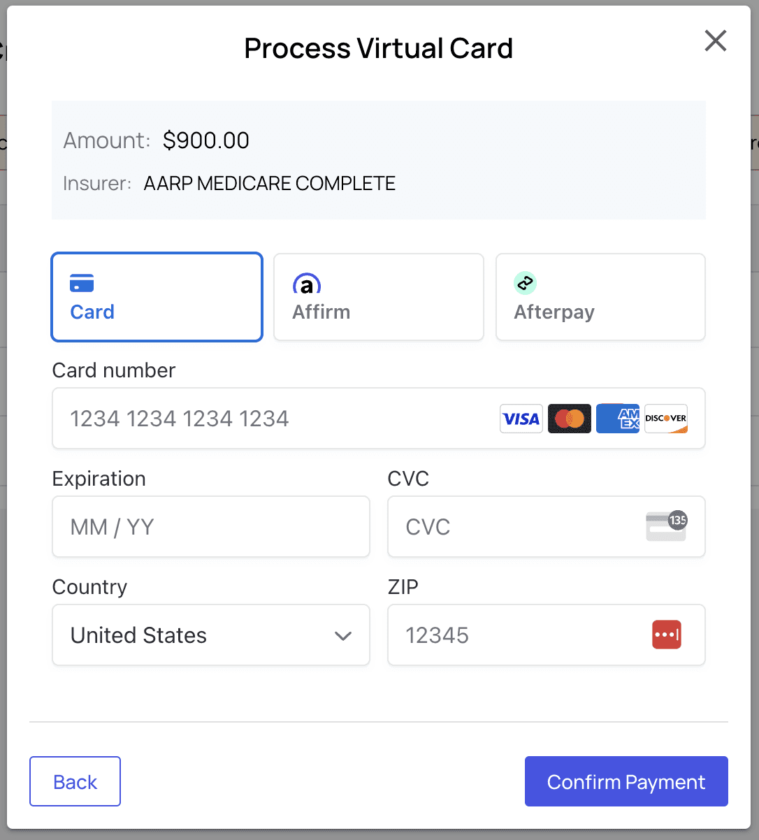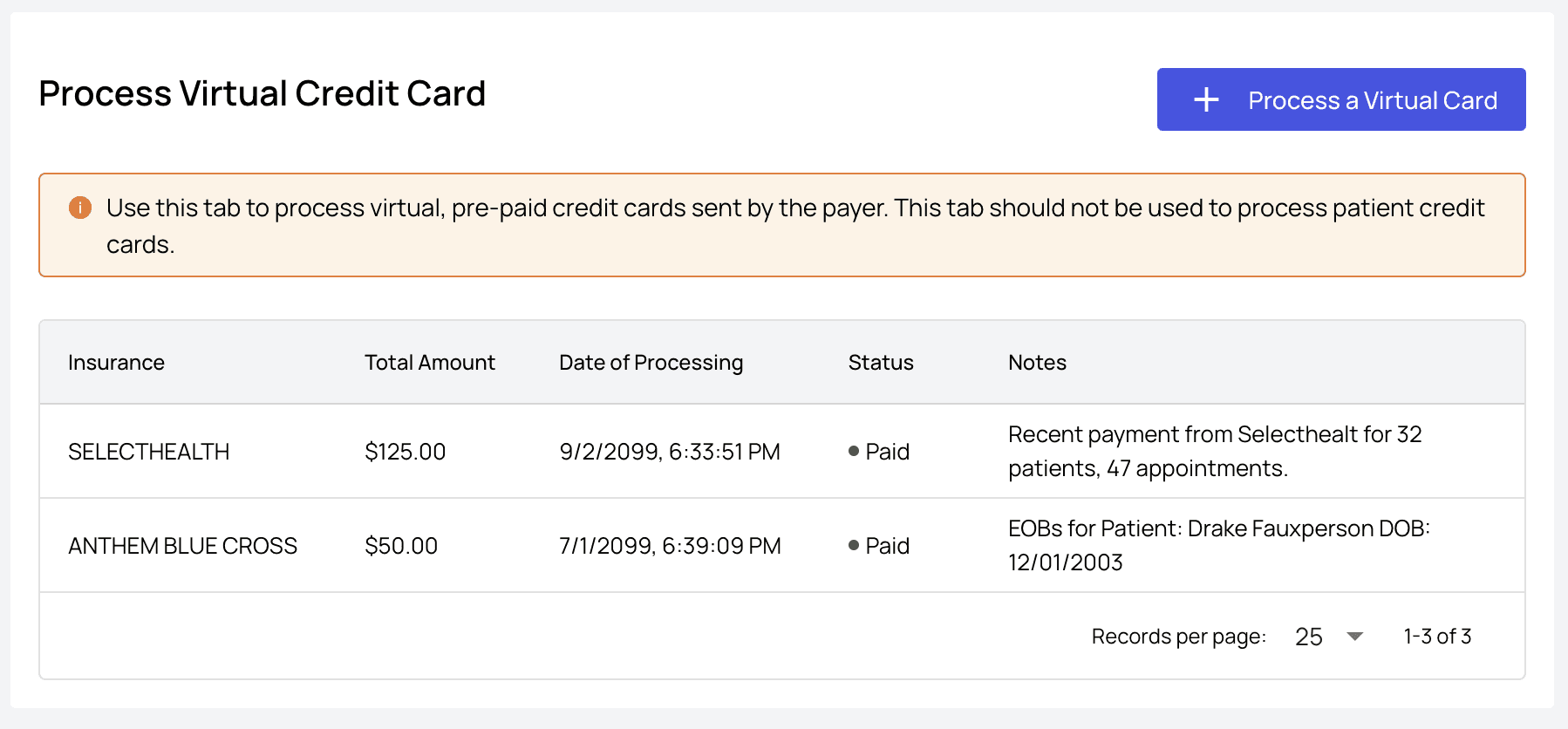 💡Virtual credit cards are digital credit cards that function like physical credit cards—but without the plastic. They will generally be sent to your practice by insurance companies as payment towards a patient’s outstanding balance. Rather than providing the same card number to multiple vendors, companies can limit their exposure to potential fraud by generating different 16-digit card numbers and expiration dates for each transaction. Do not use this feature as a means of collecting payment from patients if, for example, your card reader is down. In situations like that, follow these steps:- Charge the patient.