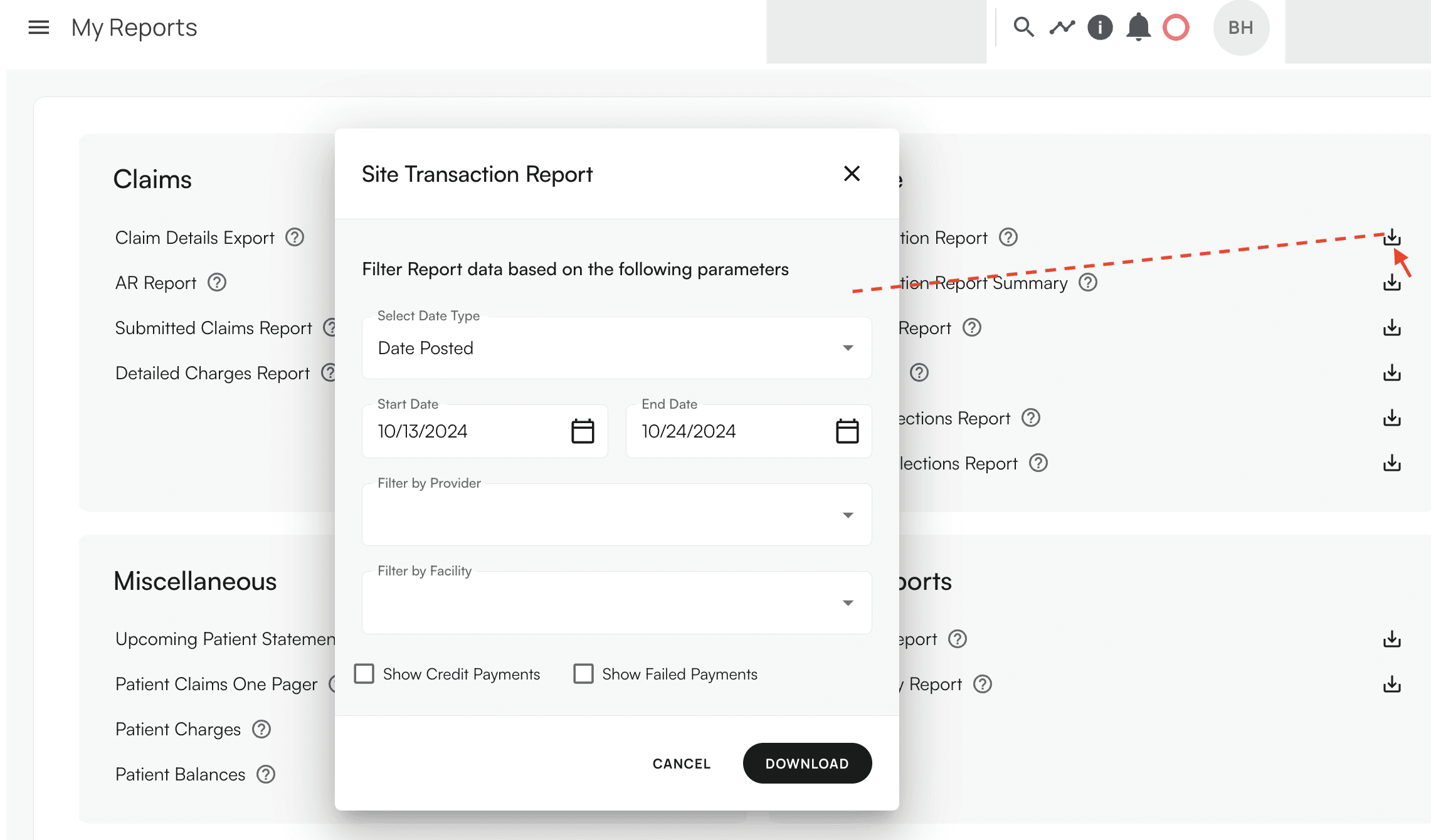 From the My Reports page, select the Site Transaction Report download button. Use the filters to specify date range, facility, provider, etc., then clickDownload
