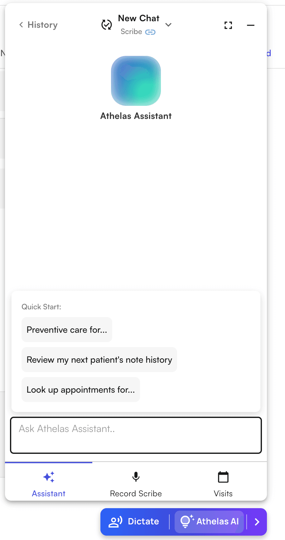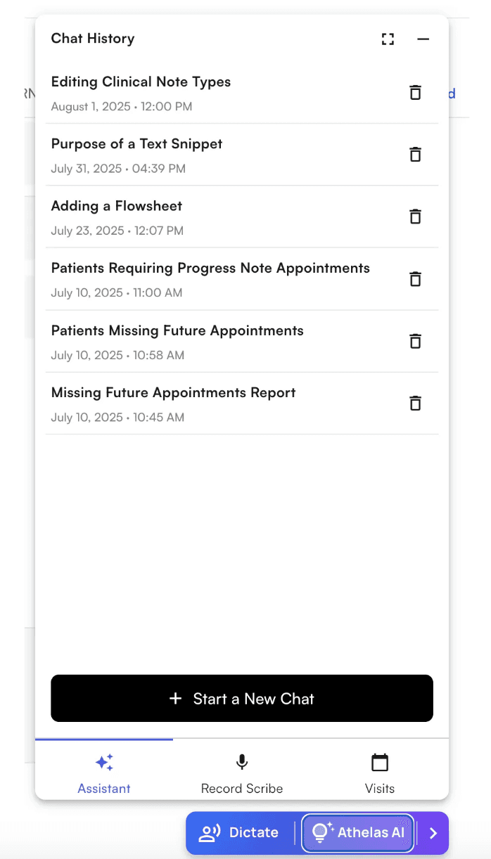 - Click “Athelas AI” to open the Athelas AI widget, and then click on the “Assistant” tab. You’ll see a chat history page with no current chats, click on the “Start New Chat” button to start chatting