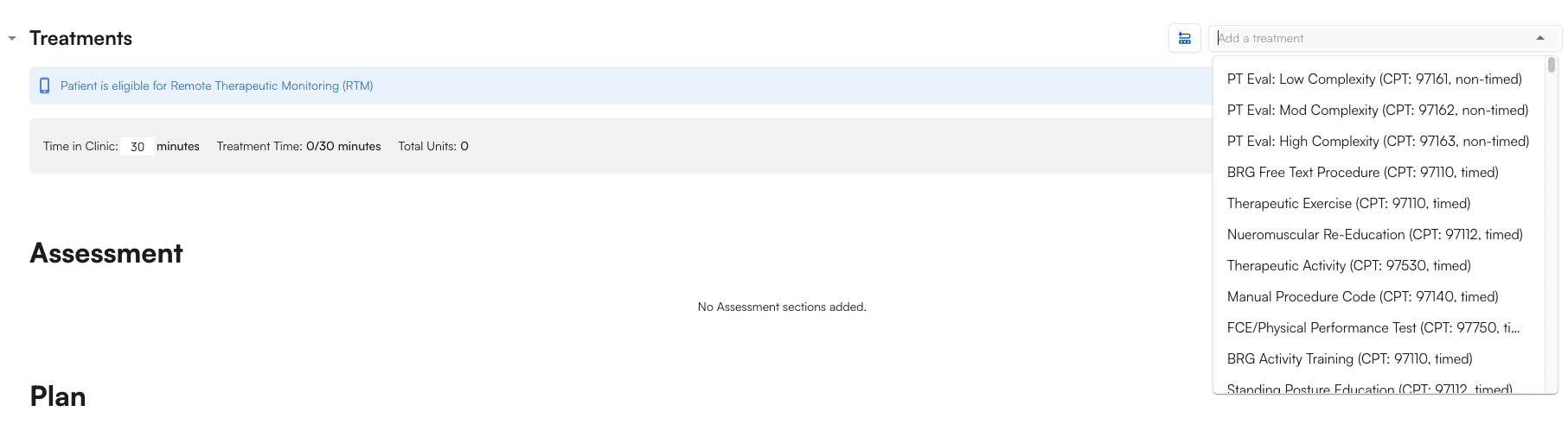 1. Scroll down to the Treatment section, where you can search for and choose a CPT code.