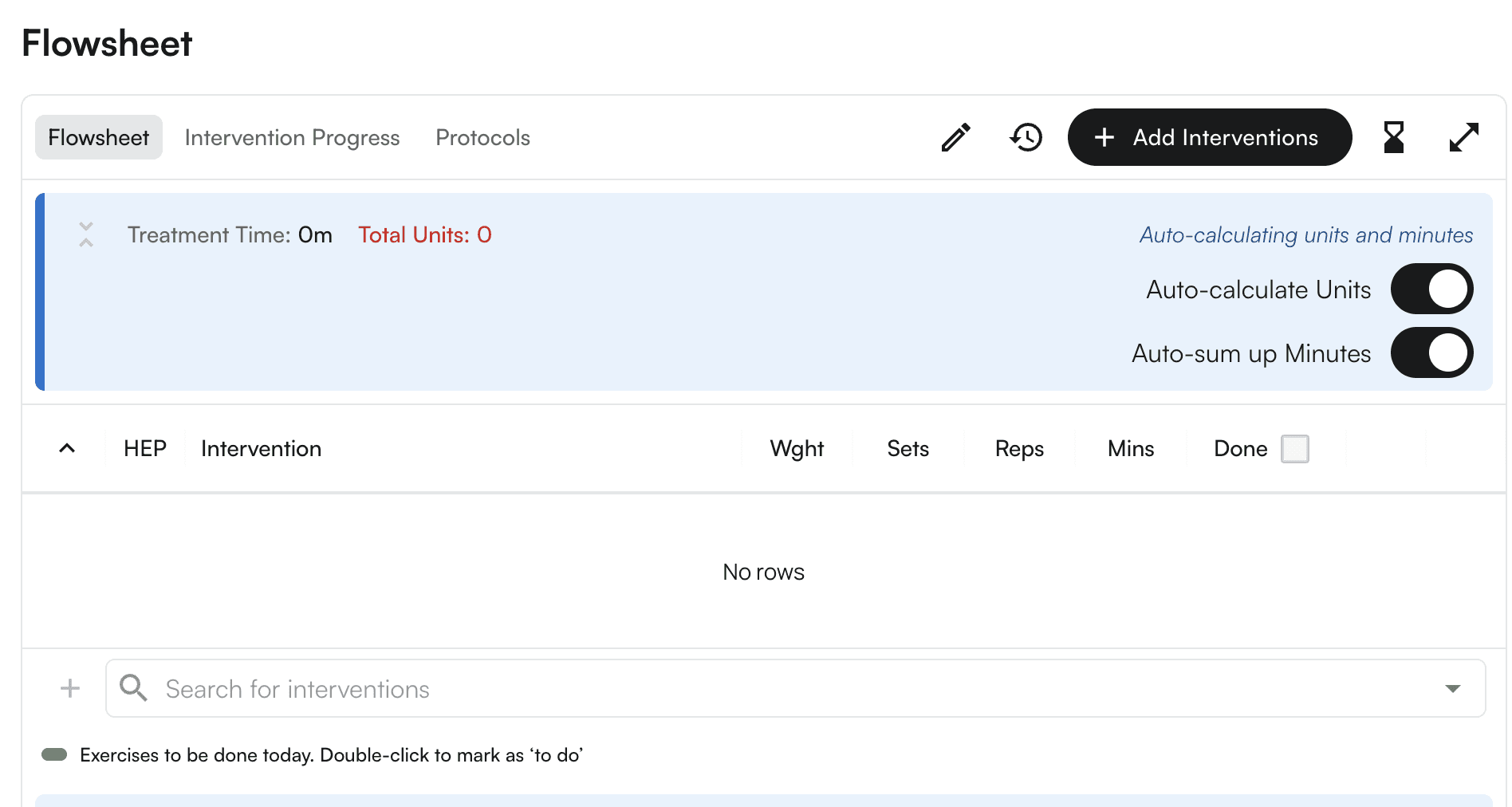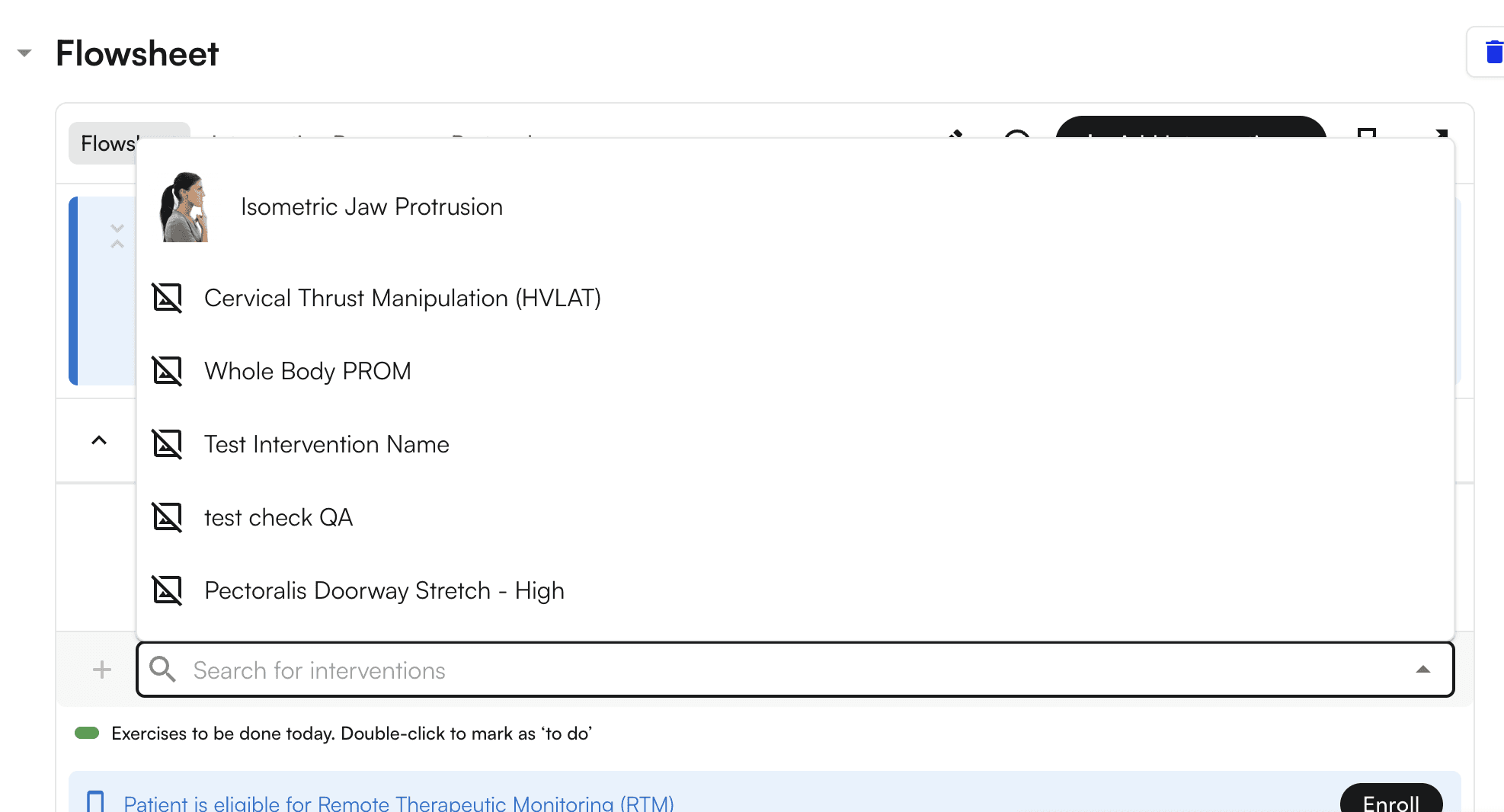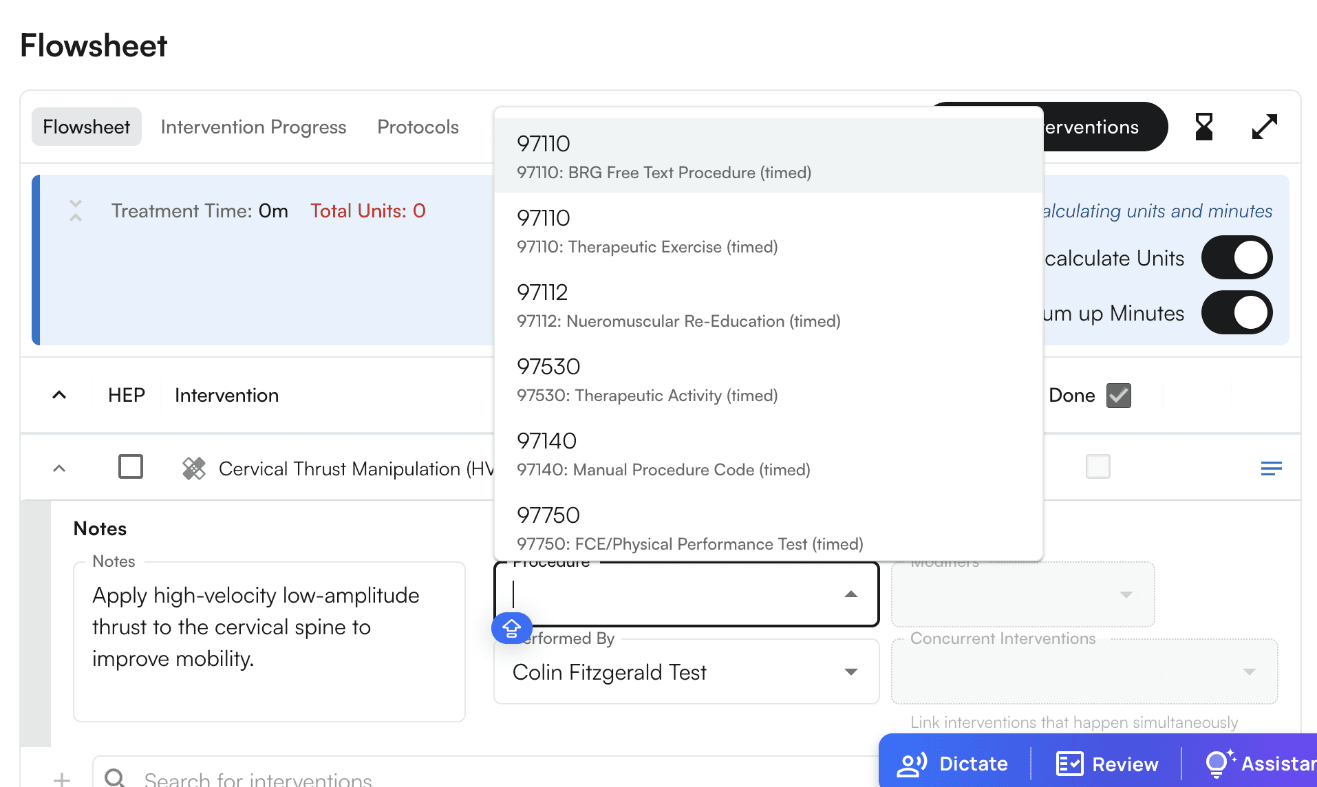 1. Scroll down to the Flowsheet section, where you can search for and choose a CPT code(i.e. “Search For Intervention).