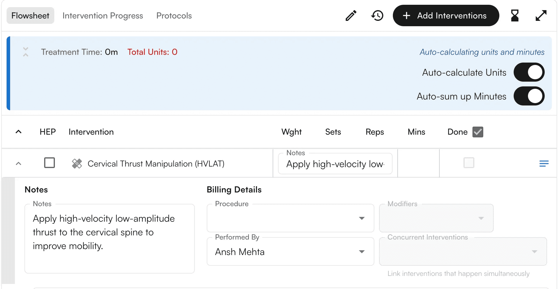 1. Select one of the interventions (e.g., Cervical Thrust Manipulation (HVLAT)).