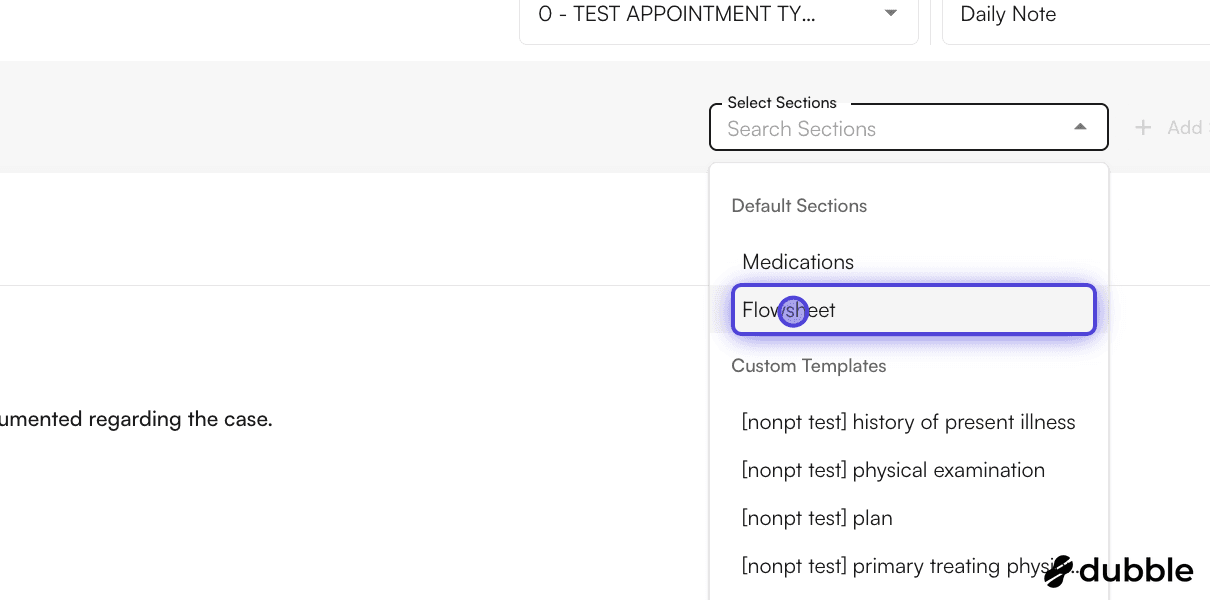 View the Flowsheets tab within your Chart notes: In order to add flowsheets as a feature onto a chart note, select it as a one of the sections to add, “Select Sections” Adding flowsheets to the chart note will remove treatments