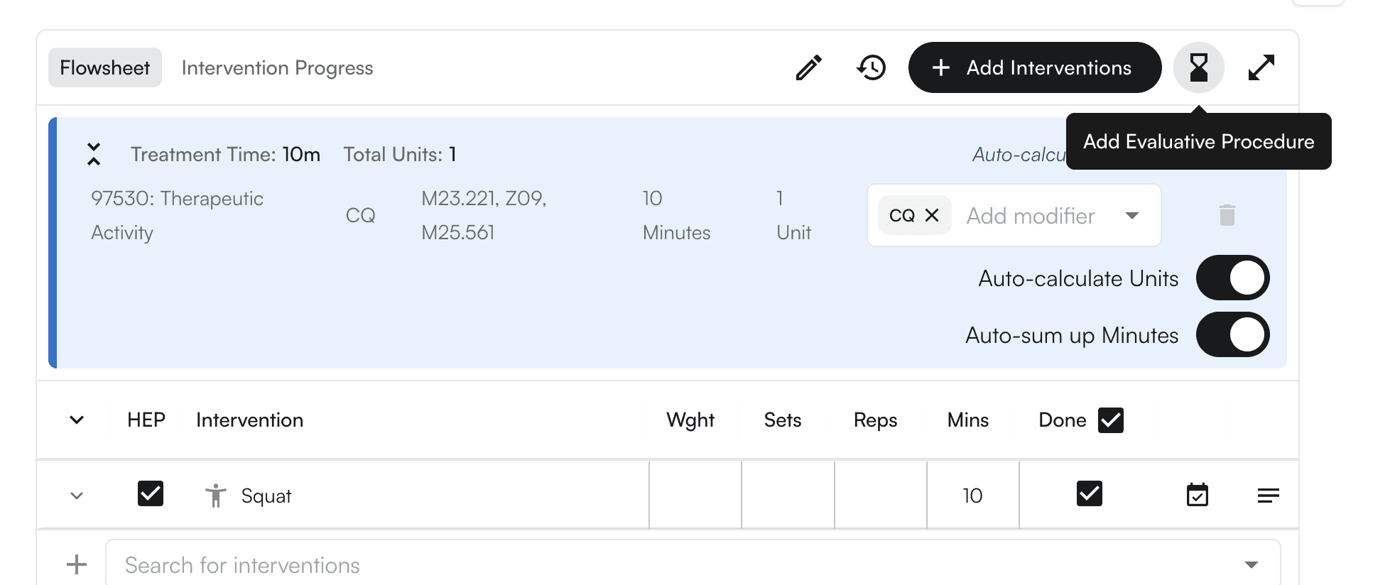 Often times, evaluative procedures may exist outside of being specified to a particular intervention. As such, we allow you to specify this from within the flowsheets feature and manage them independently. Clicking Add Evaluative Procedure will bring up a modal where these CPT codes can be selected. These evaluative procedures will be available in the blue header along with all procedures added from the interventions. Evaluative procedures can be removed from here directly if needed.