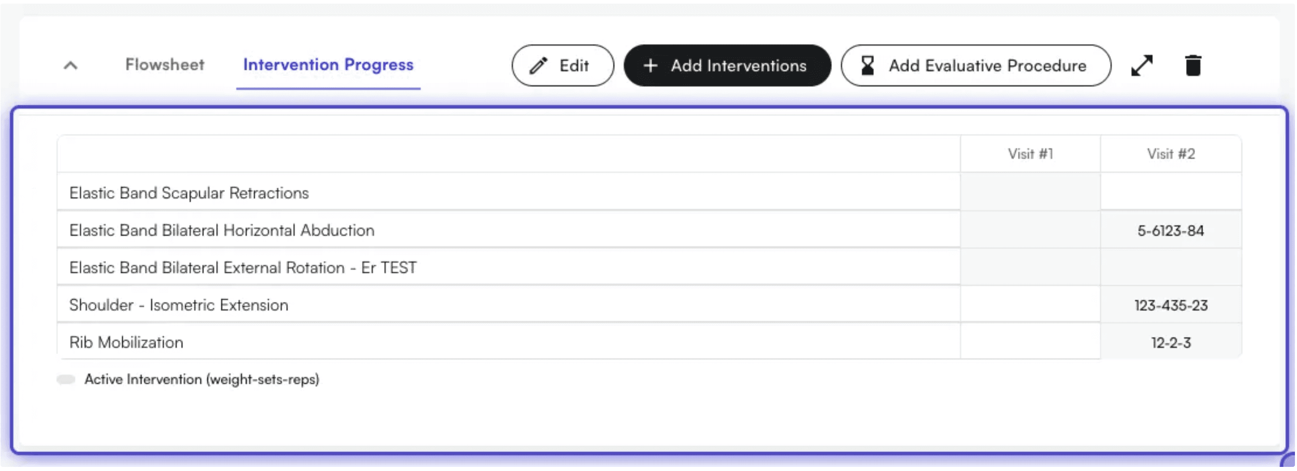 Click on Intervention Progressin the Flowsheet section to view the stats from all previous interventions If an intervention was performed for a specific visit, the background will be grey. The text inside the cells corresponds to the weight-sets-reps.
