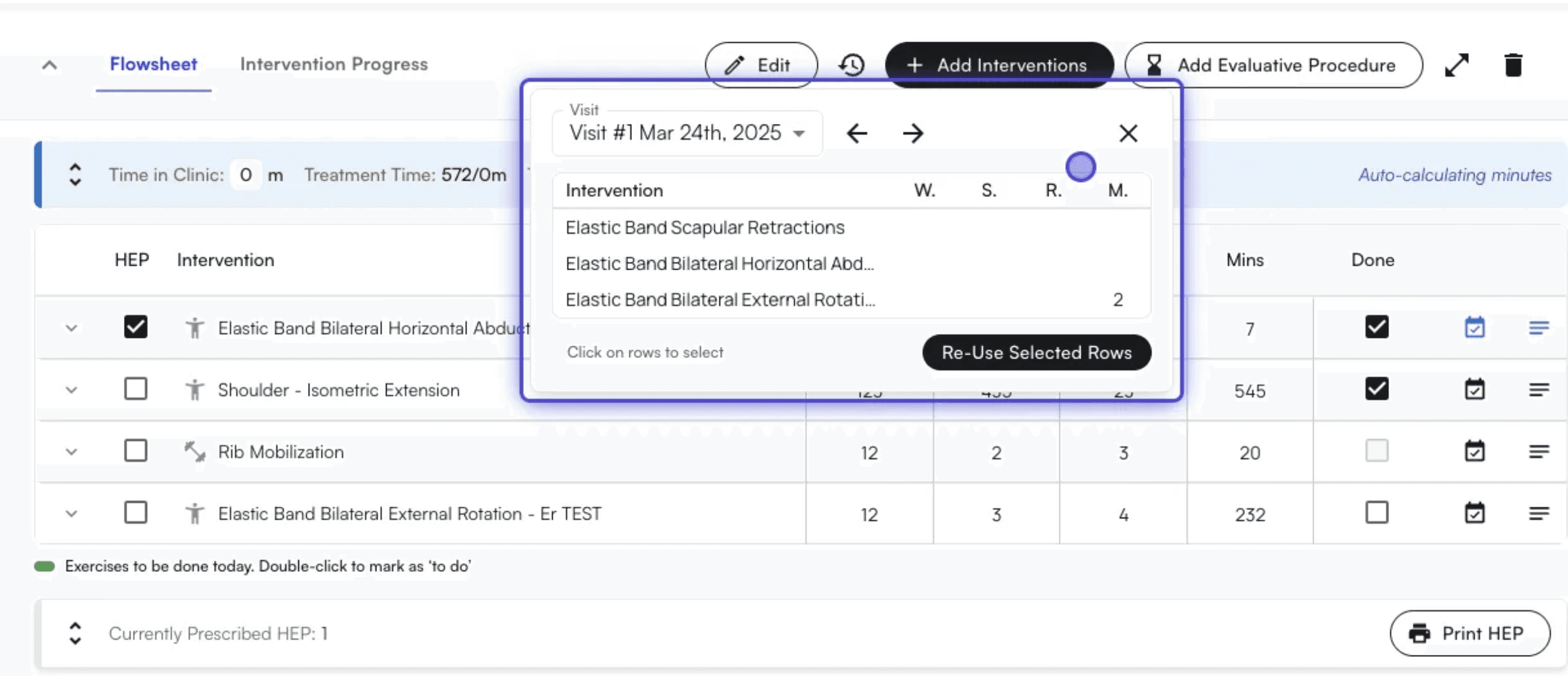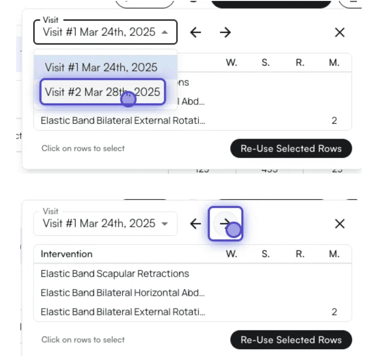 To view intervention history, click on the History icon on the Flowsheet section in the chart note From there you can see a visit by visit history of interventions, including the weights, sets, repetitions and minutes You can select which Visit to view either through the Select dropdown, or by clicking the forward and back buttons You can click on an intervention to select an intervention. You can select several interventions at once. To un-select an intervention, simply click it again After selecting interventions you want to re-use the values from, click the Re-Use Selected Rows button, and that data will be pulled into the current visit