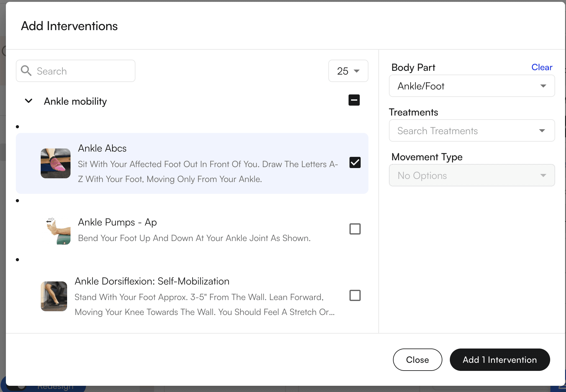 By clicking the checkbox for an intervention marked as HEP, this will add this to a staging area where a Home Exercise Program can be prepared. Clicking the caret for HEP will open up the dropdown to assign any additional notes to the HEP section on a per intervention basis. You can “Preview and Send” to email, text and print the PDF
