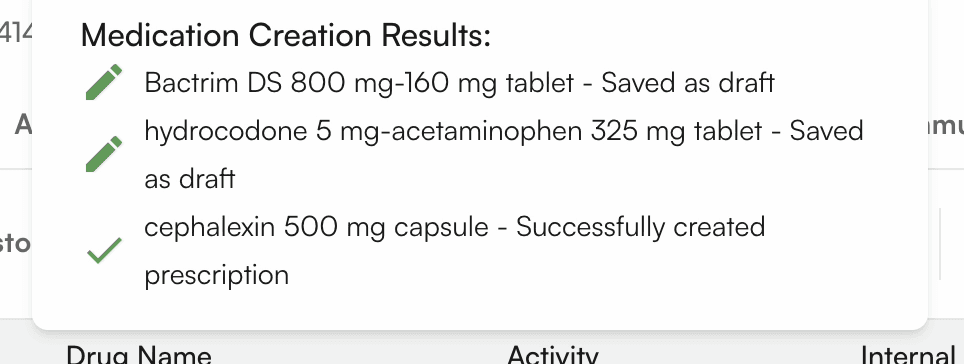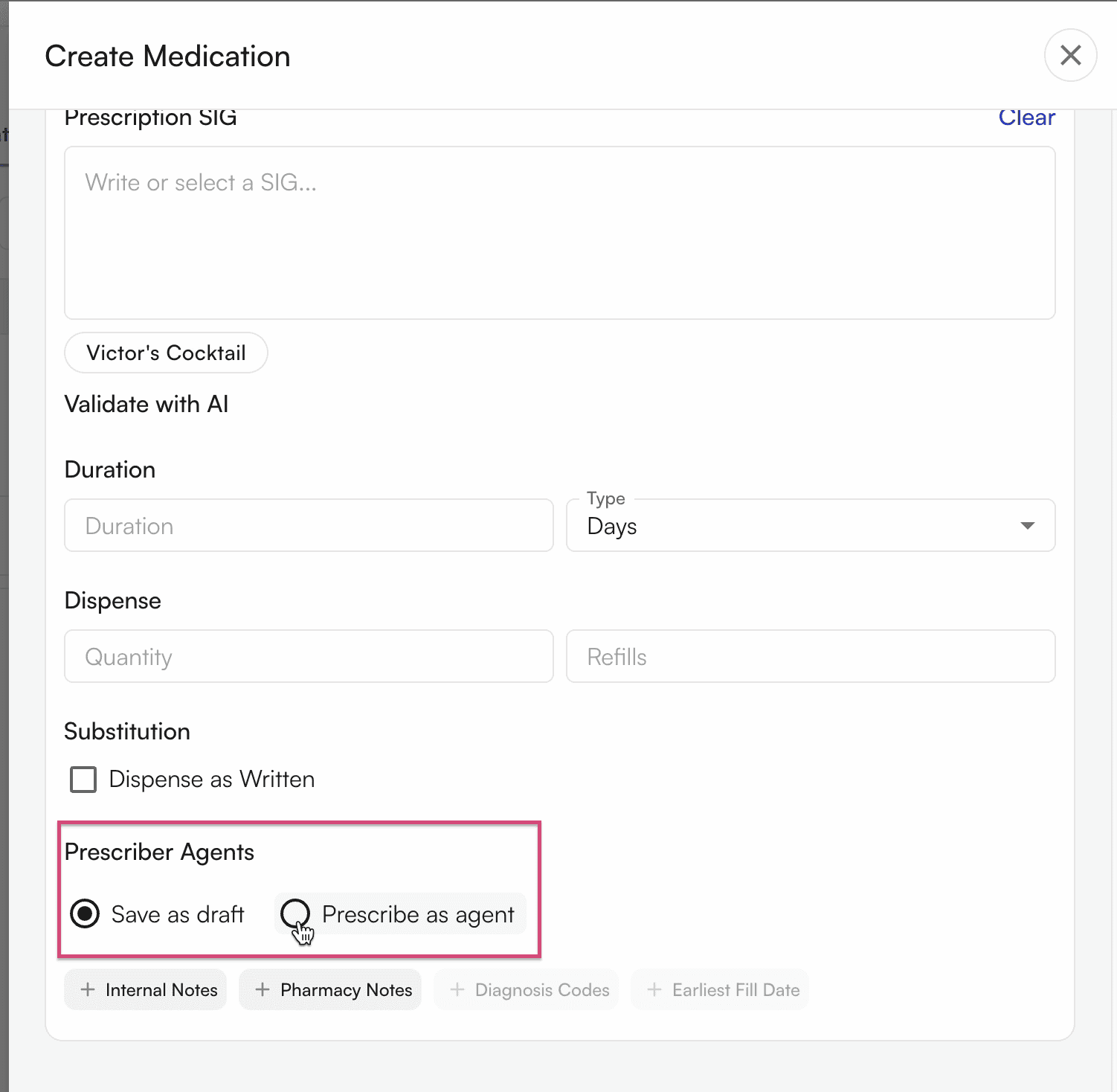 Prescriber Agent can go to the patient profile page, and select medications tab. Create a medication order. When selecting an appointment, prescriber agent will only see appointments by facility for which they are appointed to be prescriber agent. On the medication form, they will be able to select either of the two options - “Prescribe as agent” or “save draft”. Save draft is the only option they can select if they are ineligible to prescribe for that facility, or if they are dealing with controlled medications. On review, the medications which are marked as save as draft will show up as Draft Once they submit the medications, the draft medications will appear on the medications table, and a confirmation toast will show the information of the medications created. There will also be created a task created for the provider which the provider can refer to to sign off on the medications. Prescriber agent can edit the draft medications, but they cannot prescribe draft medications once they have created the draft.