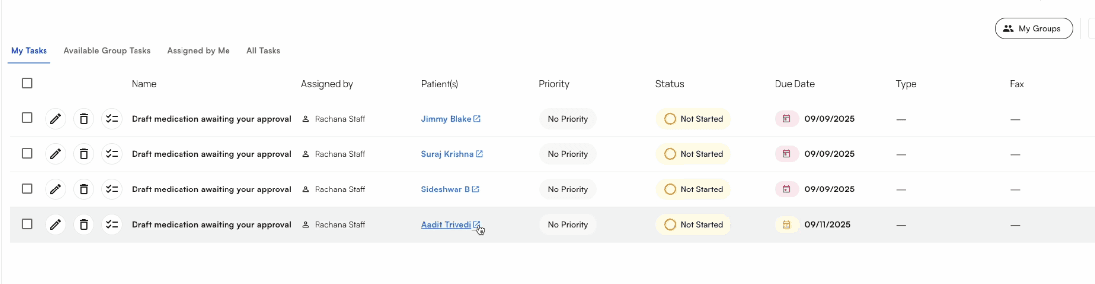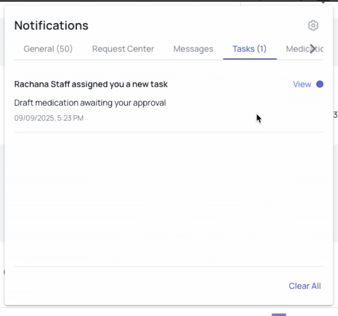 Providers can designate staff members as prescriber agents, granting them the ability to draft prescriptions for controlled medications and prescribe non-controlled medications on their behalf. Providers can assign prescriber agents by facility and set permissions for whether they can only create draft prescriptions or also prescribe medications. When a draft prescription is created, providers receive a task notification on the notification bell. Clicking the notification takes them to the Tasks page, where they can view the associated patient profile. From there, they can navigate to the patient’s profile page and review the draft prescriptions under the Medications section.