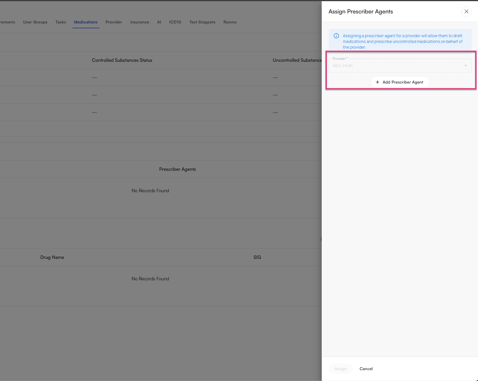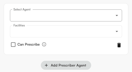 Go to : EHR > Preferences > Medications > Prescriber Agents Click on “Add Prescriber Agent” You will see yourself as the provider selected by default. This cannot be changed because prescriber agents should be set up by the provider/admin. Select agents, and add the facilities you want to allow the prescriber agent to create draft medications for. “Can Prescribe” allows the prescriber agent to prescribe uncontrolled substances directly. If “Can prescribe” is checked, the prescriber agent can still be able to create draft, they will be able to choose to prescribe along with it. Click submit after done. This creates the prescriber agents for the site and the facilities.