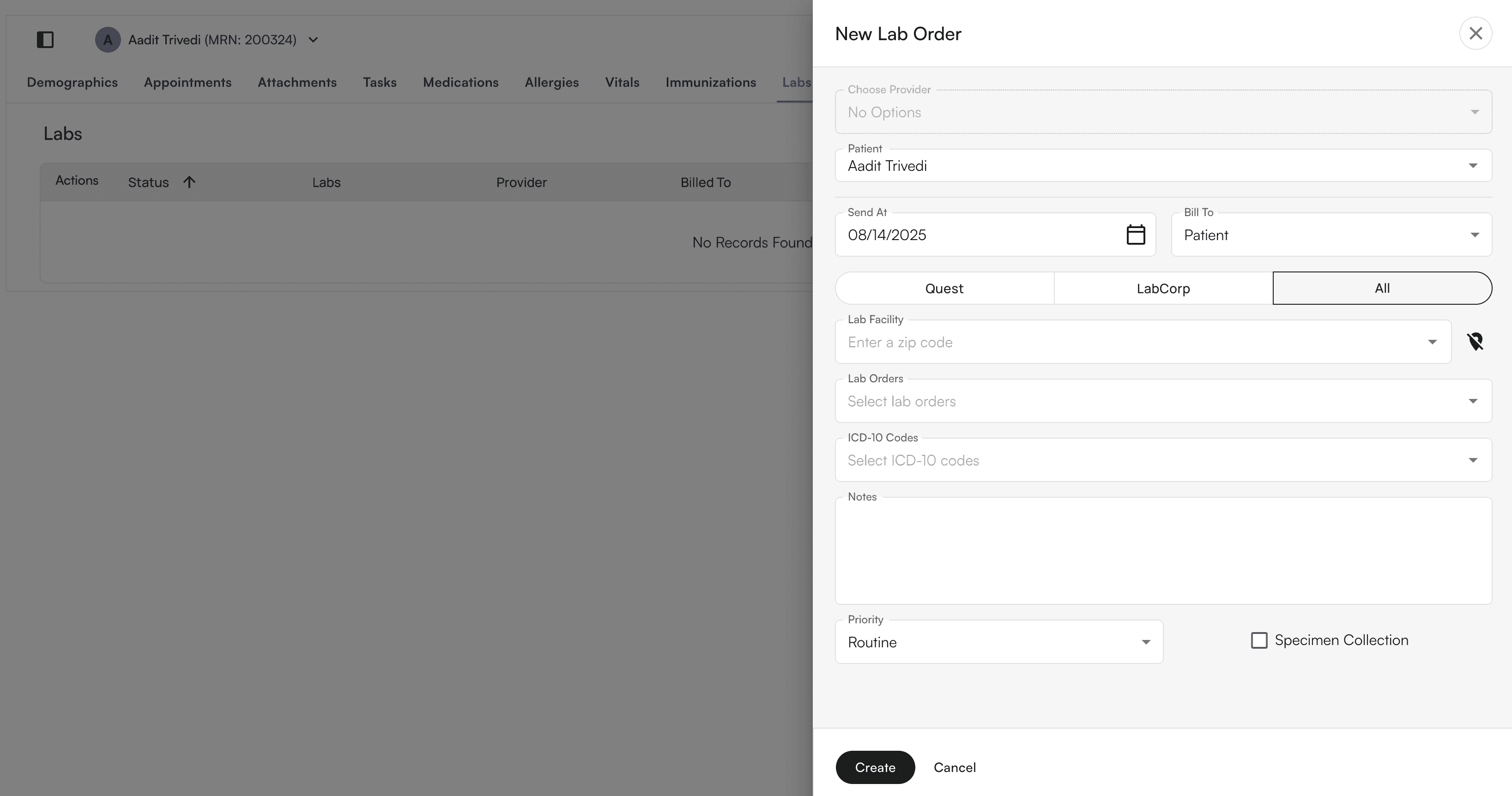 • Send and manage electronic lab orders via HealthGorilla (100+ supported lab vendors) for consultation and in-place specimen collection